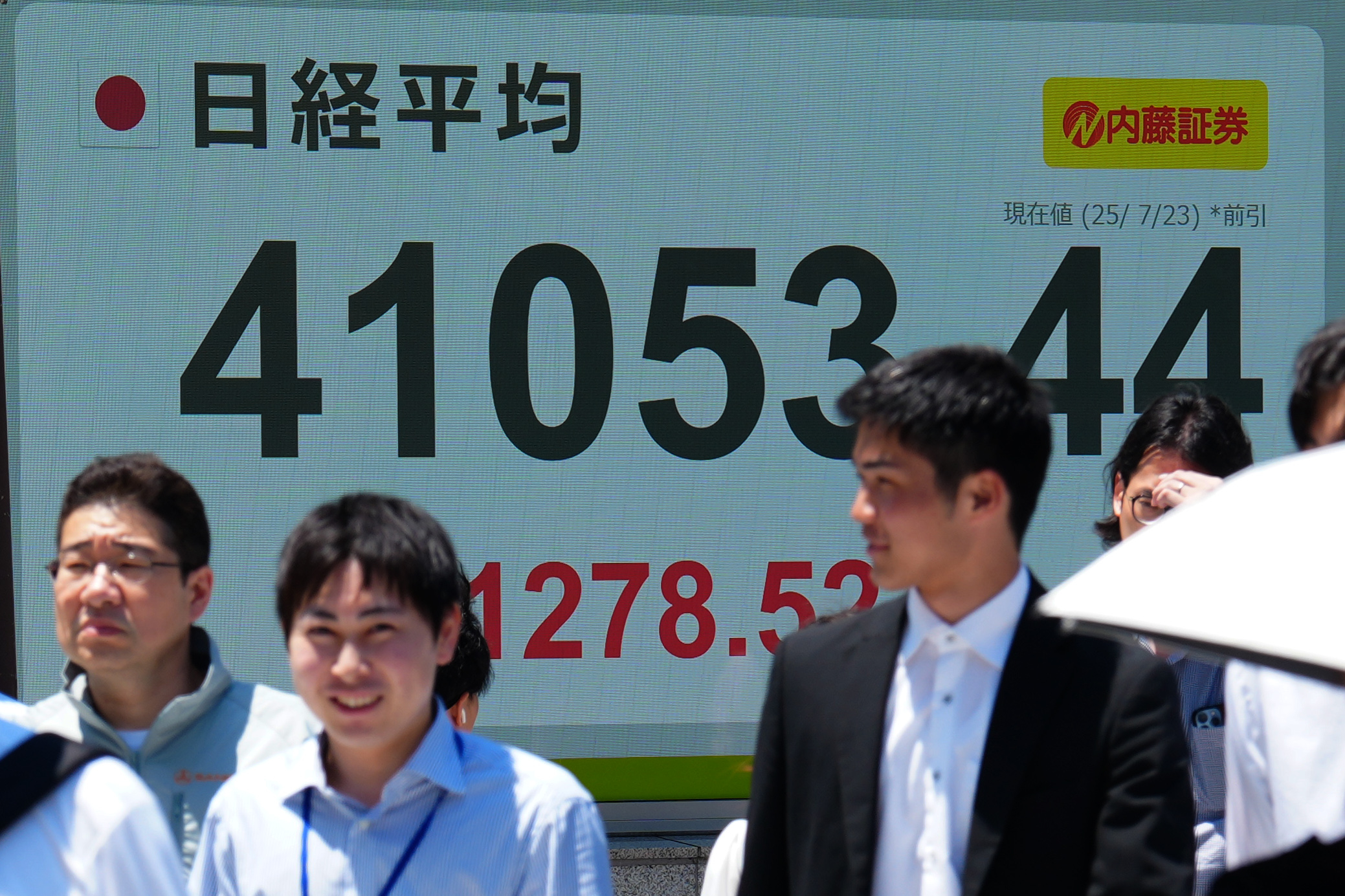 7月23日,行人经过位于日本东京的电子股指显示屏。新华社记者贾浩成摄